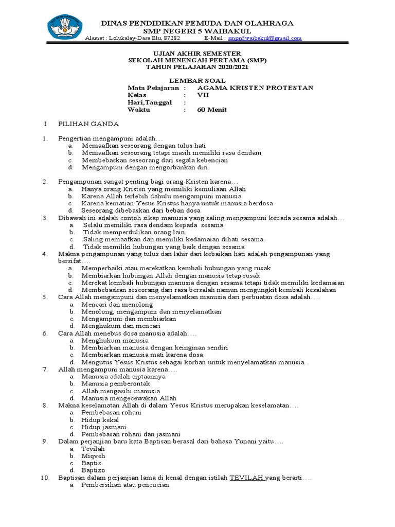 Soal-soal agama Islam kelas 7 semester 2 mencakup berbagai aspek penting dalam ajaran Islam, mulai dari rukun iman, akhlak terpuji, hingga sejarah Islam. Dengan mempelajari dan memahami materi-materi tersebut, diharapkan siswa dapat menjadi muslim yang beriman, berakhlak mulia, dan memiliki wawasan yang luas tentang agama Islam. Selain itu, siswa juga diharapkan mampu mengaplikasikan nilai-nilai Islam dalam kehidupan sehari-hari, sehingga dapat menjadi pribadi yang bermanfaat bagi diri sendiri, keluarga, dan masyarakat. Penting bagi guru untuk memberikan soal-soal yang tidak hanya menguji hafalan, tetapi juga kemampuan berpikir kritis dan aplikasi nilai-nilai Islam dalam konteks kehidupan nyata. Dengan demikian, pembelajaran agama Islam akan menjadi lebih bermakna dan relevan bagi siswa.